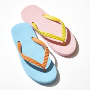 Compared to flat (same thickness throughout) sandals, tapered (low in the front, high in the back) sandals shine in walking ease. Depending on the size, the thong length along with the width are finely adjusted, slipping on our beach sandal is of the best. In addition, the thong’s location is also something to pay attention to.